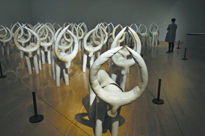 法国艺术家雅克·考夫曼的作品张扬,且哲学意味浓厚。其中一个名为《于有形和无形之间》的作品,在展厅地面上铺了许许多多大拇指肚大小的陶瓷“面疙瘩”。待参观者蹲在地上细看,才发现有些“面疙瘩”上印着兵马俑的脸,有些则仅仅是被捏出一点褶皱。几百个这样的“面疙瘩”组成一个巨大的圆,让观众不由自主想要绕着它转上几圈。