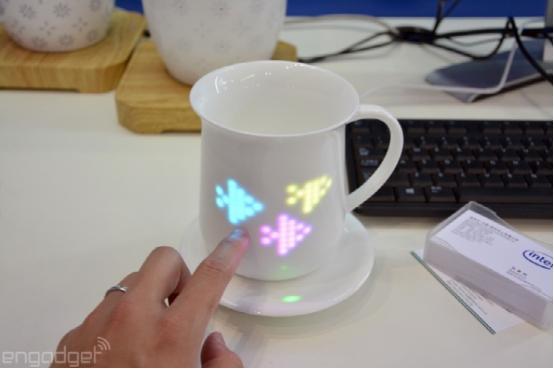 没错,这款陶瓷智能花瓶和水杯内置了英特尔Edison处理器模块,同时在透明陶瓷部分内壁镶嵌了一块12×16像素的触控显示屏。一旦打开开关,这款屏幕上就可以显示一些滚动信息,包括天气预报、同步智能手机播放的音乐列表、微信通知,甚至是简单的游戏。