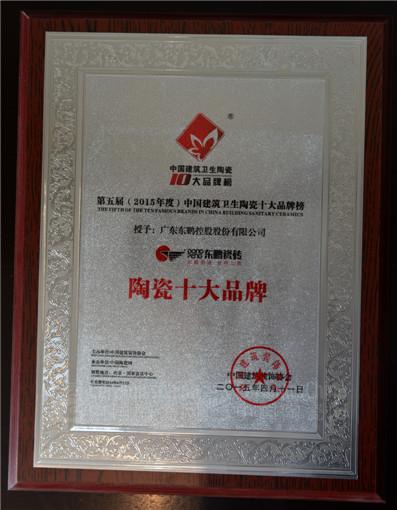 2015年4月11日,第五届中国房地产与泛家居行业跨界峰会暨2015年中国建筑卫生陶瓷十大品牌榜颁奖盛典在北京国家会议中心盛大召开。中国建筑装饰协会会长李秉仁,前华远集团董事长任志强,前临湘市副市长、现湖南民族职业学院《官路》作者姜宗福等领导、嘉宾出席了此次盛典。会上揭晓了2015年中国建筑卫生陶瓷十大品牌榜,东鹏控股旗下瓷砖品牌—东鹏瓷砖凭借强大的综合实力,荣获综合类“陶瓷十大品牌”和专业类“瓷片十大品牌”称号。