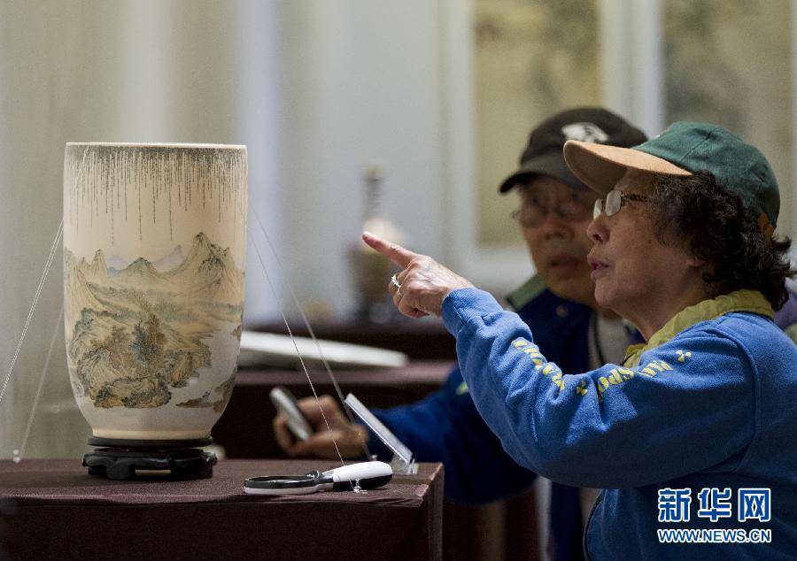 4月28日,观众在加拿大多伦多中华文化中心参观“陶瓷微书”作品。作为2015-2016中国与加拿大文化交流年的一项内容,中国国家级非物质文化遗产——“陶瓷微书”作品展于4月24日至5月1日在加拿大多伦多举行,展览展出了项目传承人王芝文的数十件作品。“陶瓷微书”将中国书法艺术与陶瓷艺术相结合,在不用任何放大设备的情况下,运用难度极高的微小文字在瓷器上创作。新华社发(邹峥摄)