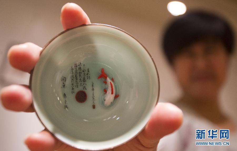 4月28日,在加拿大多伦多中华文化中心,一名工作人员展示一只小茶杯底部的微书法。作为2015-2016中国与加拿大文化交流年的一项内容,中国国家级非物质文化遗产——“陶瓷微书”作品展于4月24日至5月1日在加拿大多伦多举行,展览展出了项目传承人王芝文的数十件作品。“陶瓷微书”将中国书法艺术与陶瓷艺术相结合,在不用任何放大设备的情况下,运用难度极高的微小文字在瓷器上创作。新华社发(邹峥摄)