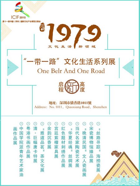 作为顶级文化生活交流的新平台,深圳1979文化生活新领域,凭借其站立时代大潮之上的精神以及罕有的中央湖畔商业哲学,现已确定为第十一届中国(深圳)国际文化产业交易博览会分会场,且成为文博会“一带一路”文化系列展的重要展区。“一带一路”文化系列展览将于2015年5月14日——2015年5月18日在深圳1979文化生活新领域盛大启幕。