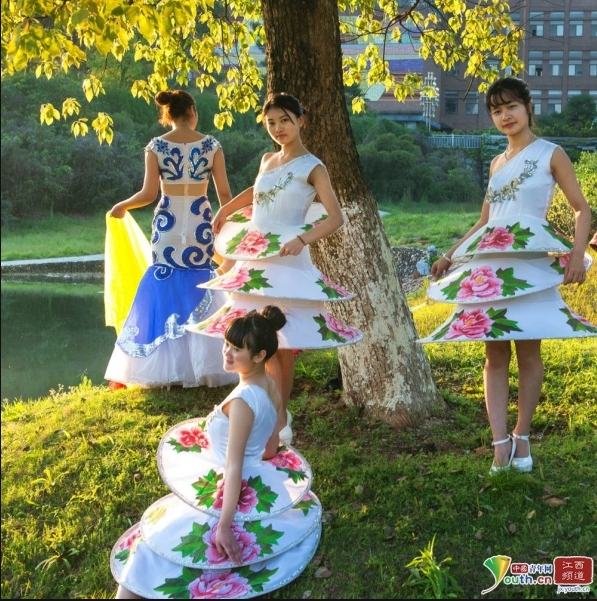 中国青年网景德镇5月7日电(记者 戴利斌)“白如玉,明如镜,薄如纸,声如磬”,景德镇,千年窑火不断,陶瓷文化百花齐放。近日,景德镇陶瓷学院大学生礼仪团的女大学生们,通过自己设计制作的陶瓷服饰展示了瓷都典雅素净的青花瓷、晶莹剔透的玲珑瓷、五彩缤纷的颜色釉瓷和古朴清丽的粉彩瓷的“四大名瓷”特色。大学生们还穿上自己亲手制作的陶瓷服饰在校园内拍摄了一组陶瓷服饰写真集,吸引了不少眼球的关注。
