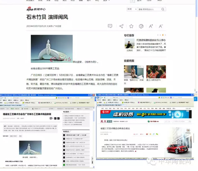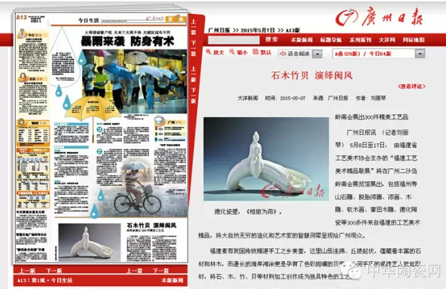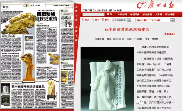 当代德化陶瓷名家精品展”与“福建工艺美术精品联展”已连续三届的成功举办,不仅赢得了各界的青睐,也为德化陶瓷及福建工艺美术精品搭建起了一个集展示、交流及流通的良好平台。还获得各界媒体的关注,广州日报、新浪网、信息时报、中华陶瓷网等媒体都报道了本次联展,凤凰网、网易新闻、雅昌新闻、环球网、东方网、天津网、中国日报网、21CN等几十家媒体转载报道。同时中华陶瓷网及官方微信平台集中对本次活动进行跟踪连续报道,并对展出的作品进行分期欣赏展示。