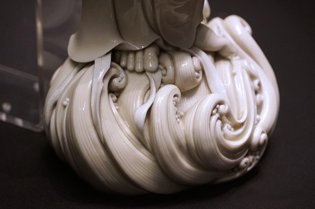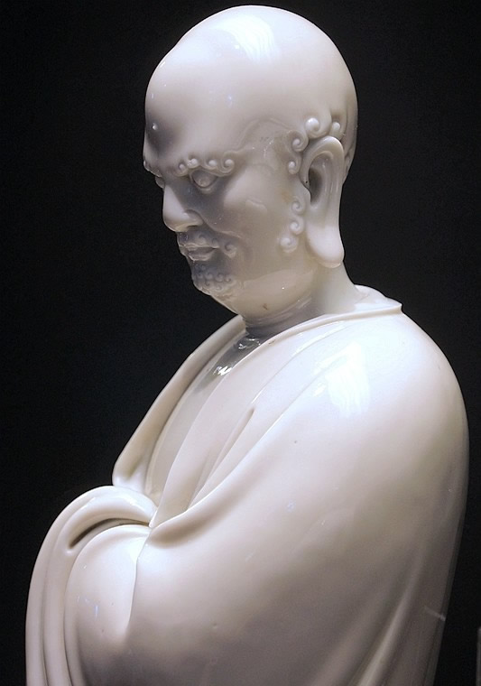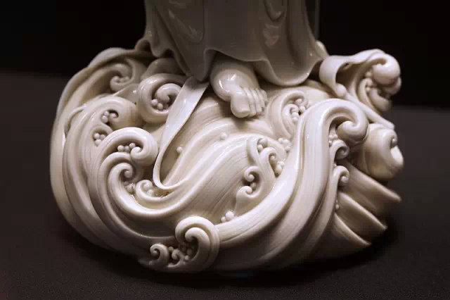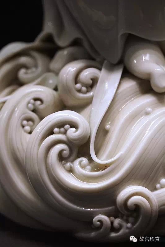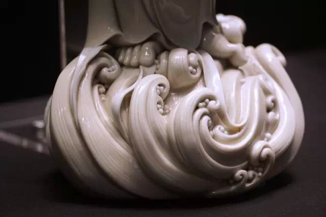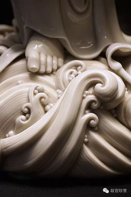 而何朝宗最为精彩的传世瓷塑名作《达摩立像》,这件立像与其他德化窑瓷塑人物一样,体量不大。但却将波涛之上一苇渡江的达摩表现得维妙维肖。何朝宗所作此像,在精准优美的人物形象塑造和令人叫绝的衣纹水波再现之外,正所谓——妙不可言。