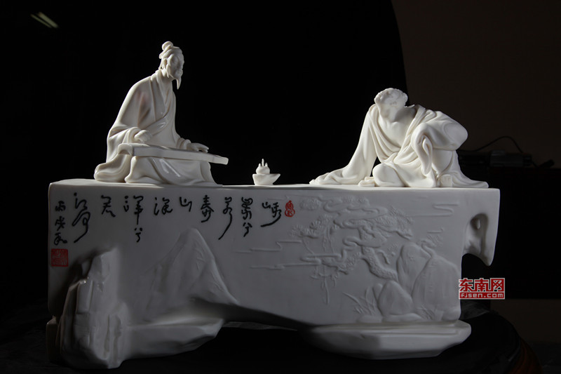 “抱琴观鹤”,正是寄托了颜松柳在德化白瓷艺术道路上的不懈追求的情怀:无论是对何朝宗传统的守望,还是创作符合现代审美情趣的作品,颜松柳一直致力于对德化瓷土泥性的挖掘,他希望,烧制的瓷塑作品,不仅闪烁着人性光辉,而且散发着文人情趣,犹如一曲古琴,绕梁三日,意味深长。