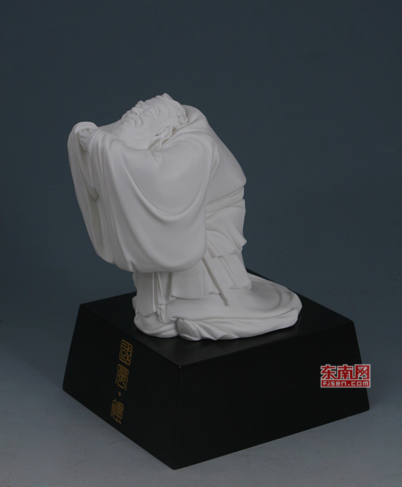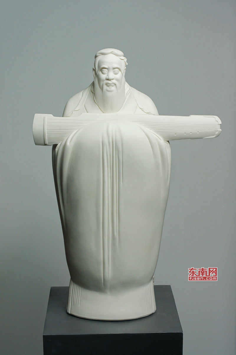 于是,评委们看到了一尊别具一格的孔子瓷塑:一身长衫的孔夫子仍然是拱手于前,但是长袖之上,拱托着一把古琴,将这位至圣先师传礼乐于天下的迫切心愿,活脱脱地刻划出来!