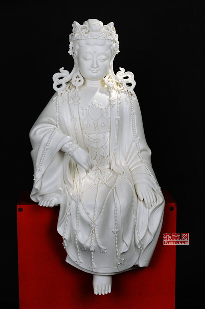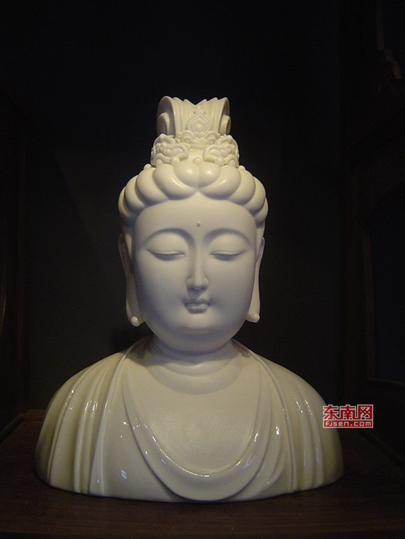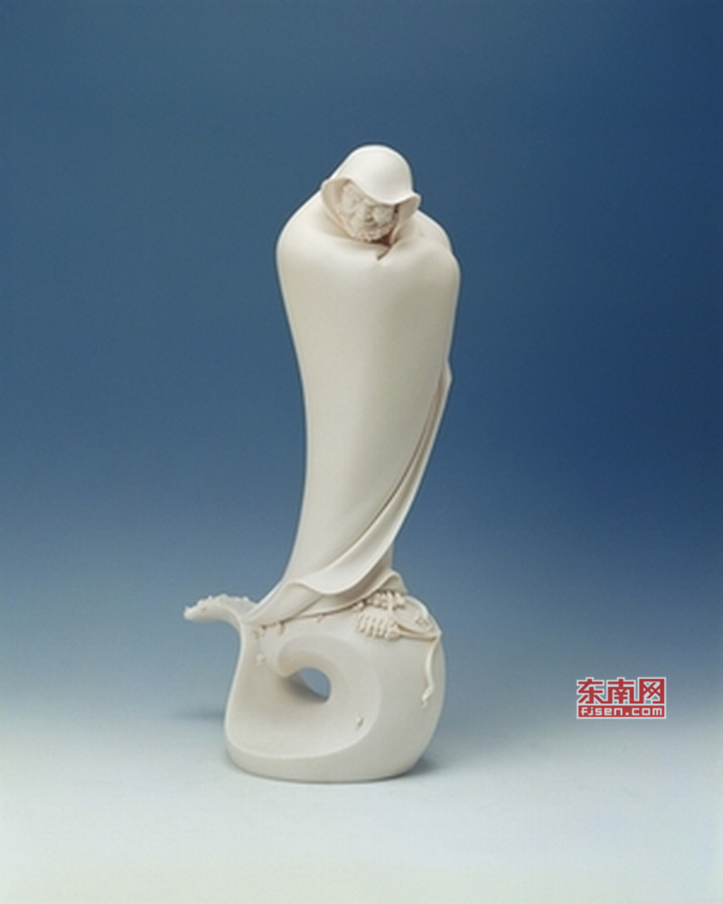 在他的理解里,德化陶瓷人物造像的开山宗师何朝宗著名的观音作品,便是“闪烁着人性光芒”的经典之作,最著名的《渡海观音》,观音将双手优雅地藏于衣袖之中,优雅略带着矜持,她双目低垂,神态悠闲自在,脸上投射出恬静柔美之光,如同古玉一般。
