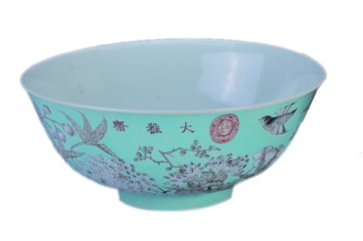 明代“内府”即内府衙门,为直接服务于皇帝的宦官机构。估价18万元的明代黑釉内府款酒罐,高61厘米,模印“贡酒”字样,为宫廷盛放贡酒之用。估价6万元的大雅斋碗,为光绪景德镇官窑器。“大雅斋”为慈禧御用画室斋号,大雅斋瓷器即慈禧大雅斋画室专用瓷。估价8万元的明嘉靖云鹤纹瓜棱杯,造型典雅,胎质坚致细腻,纹饰清晰流畅,云鹤飘逸生动,气势恢宏,尽显皇室威仪。估价10万元的建窑兔毫盏,造型规整,口沿釉薄处呈铁锈红,内底呈棕黑色,中间以斑驳的丝纹过渡,美不胜收。底刻“贡”字款,更显皇家之风。此外,罕见的耀州窑鹧鸪斑纹盏,体形优雅,秀美端庄,估价40万元。原装齐整的一套青白瓷围棋罐带棋子,出自景德镇湖田窑。精细温润的白玉镶双鱼葵口水洗,采用水磨技术,胎体透薄。