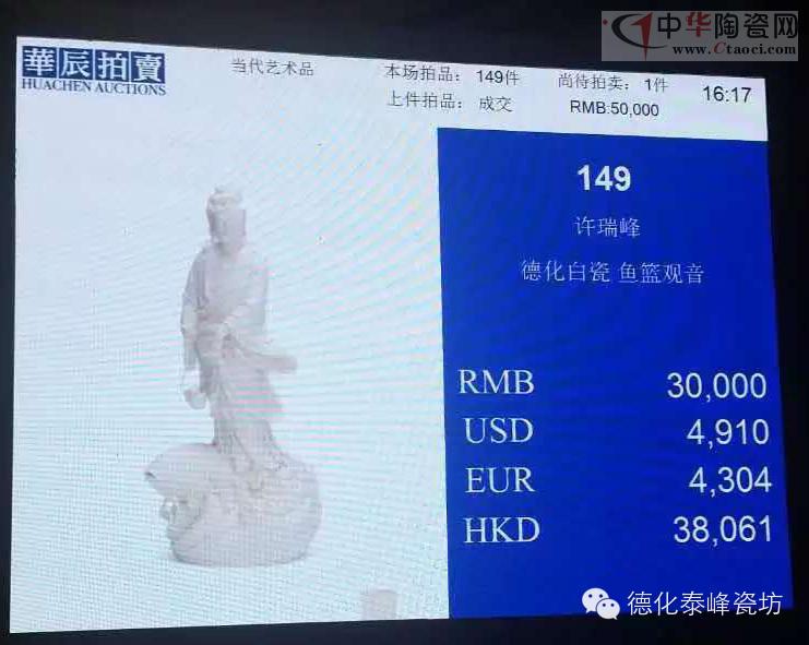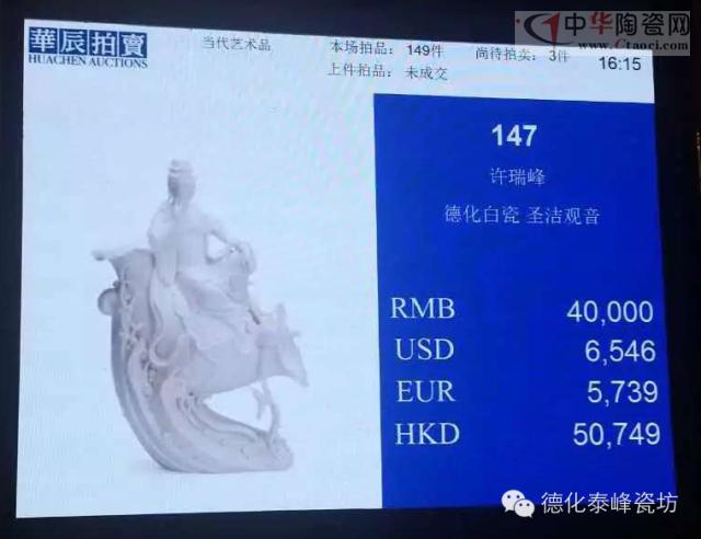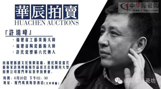 由福建艺盛文化策划组织,德化百年瓷艺世家许氏第六代传人、当代艺术家许瑞峰的个人艺术作品首次走进国内大型拍卖公司厦门华辰春季拍卖会。6月20日,厦门华辰春季拍卖会圆满落幕,拍出藏品总成交金额五千多万元。
