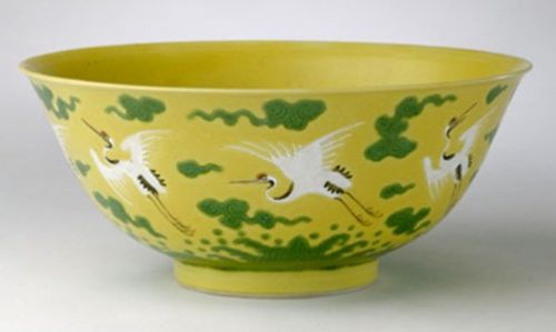 清代瓷器,仍以景德镇为中心。在明未连年混战当中,景德镇也受到严重损坏,窑场凋零,匠人四散。直到清顺治十一年才恢复生产,景德镇复为御窑厂。这一时期的产品有明显的过渡时期特征。胎体比较厚重,制作略显粗糙,一般底部斜削草率,还粘有砂粒。器物沿口部分施酱黄釉,深浅不一,呈黄褐色,为顺治时期的重要特征。