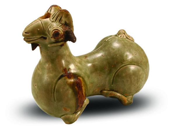 1980年镇江市谏壁砖瓦厂东晋墓出土越窑青釉点彩羊形烛台(图3),高14.7厘米,长17厘米。羊作跪伏状,昂首张口,双耳长伸,卷角后弯,下颚贴塑胡须,臀部上端贴印短尾,头顶有一圆孔,中空,用以插烛。胎灰白色,釉色莹润,眼睛、耳朵、肌肉突出部点有褐彩,起到了画龙点睛的艺术效果,为越窑青瓷中的精品。羊形烛台曾被认为是插物的插座,它的造型与河北省满城中山国王刘胜墓出土的铜羊灯一模一样,唯一的区别是铜羊灯的羊背可以翻转搁在羊头上作灯盏,瓷羊的额部镂一孔,用以插烛,两者的照明点都在羊头上。
