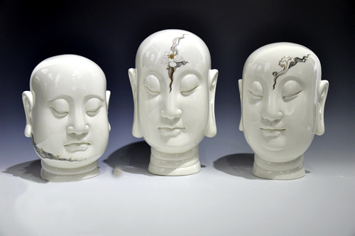 作品实为作者内心自白,将瓷塑与瓷彩结合,以一组三种表情各异的脸相,饰以相应指征的装饰图形,表现修道的三重境界,与丰子恺先生一再倡导的“俗世、艺术、人生”三境界相侔。《地上水》表情悲愤、百欲缠身,有浊气、俗气。《天上云》笑意盈嘴,有理想、有向上的清气。《心中莲》超凡脱俗,不悲不喜,如莲化初绽,证得大道。三头像线条刚劲大气,表情与装饰暗示作者的人生体悟,在在灿烂着心灵追索的光辉。
