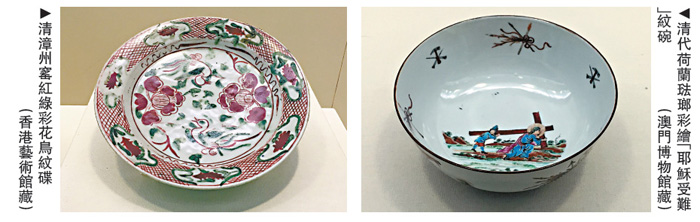 明末清初,欧洲各国陆续来华寻求通商贸易。广州作为通商口,外商必须通过广州行商进行贸易,澳门则成为广州港的外港,再次促成广州对外贸易的繁荣时期。十八世纪上半叶,中国商人在广州设坊,专事上彩,并可供客人就地验货,专供外销,外商还可以来样定製,这就是别具风格的广彩瓷。“广彩”即“广州织金彩绘瓷”的简称,此次展出的多件广彩瓷多为碗、碟、瓶、盘、餐具,器型纹样部分是西式的,图案明显带装饰性,色彩艷丽。这个时期的外销瓷不仅品种丰富,在纹饰图案的主题更加多样化,以基督宗教为主题的瓷器就涵盖《圣经》中描述的事物、“耶稣会”章纹,以及神迹等。