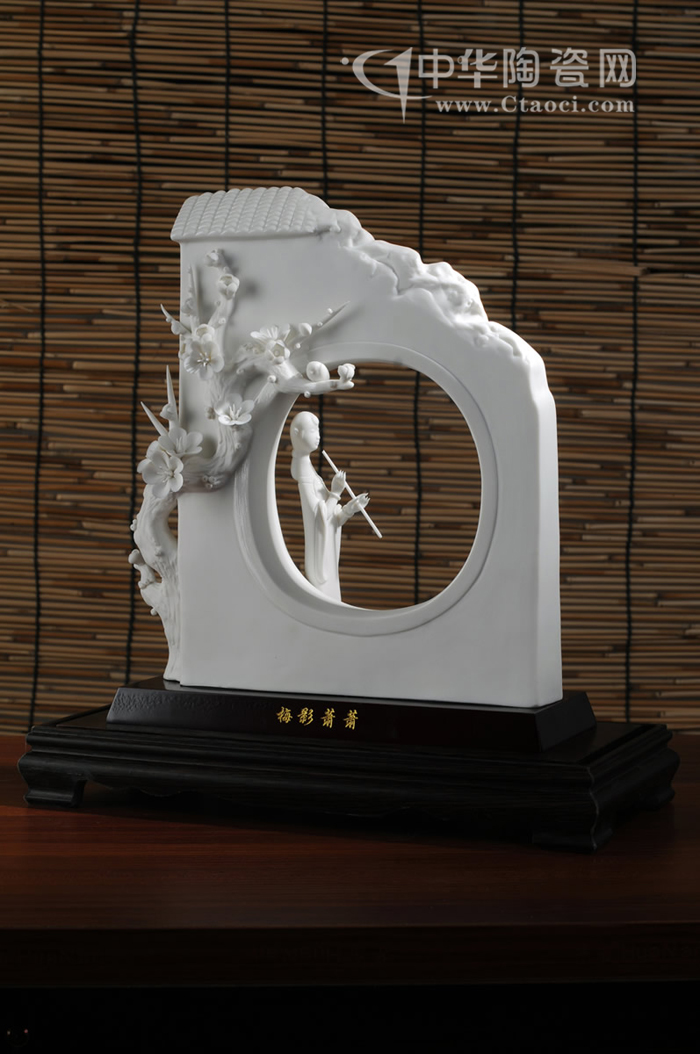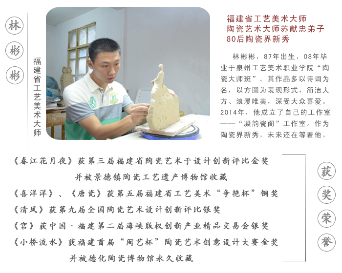 林彬彬,1987年出生在德化县南埕镇的林彬彬,人如其名,是个彬彬有礼的腼腆大男孩。2003年考入泉州工艺美术职业学院五年制大专“陶瓷大师班”学习雕塑,毕业之后继续师从中国陶瓷艺术大师——苏献忠,2014年成立了“凝韵瓷阁”工作室。据其介绍,“凝”是取“凝聚”之意,“韵”则是“韵味”,希望自己能够把德化陶瓷艺术最美好的“味道”创作好,表现好。其作品风格非常唯美,带着浓浓的古典诗情意境,仿佛是一幅立体的画,展示了古典诗词所营造的氛围。