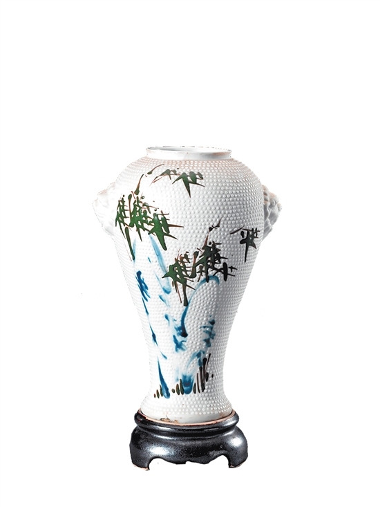 “珍珠釉竹鸟纹双耳瓶”