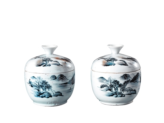 蓝彩山水纹盖罐