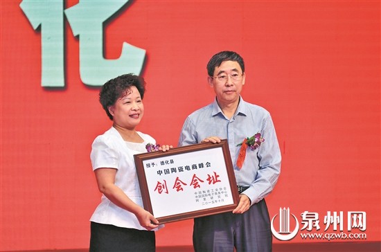 ▲中陶协理事长杜同和宣布德化为中国陶瓷电商峰会创会会址,德化县长欧阳秋虹接过创会会址牌匾。