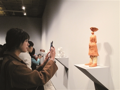 9日,“丝路瓷语——2015国际当代陶瓷艺术精品展”在北京劳动人民文化宫太庙艺术馆开幕,展览共展出来自22个国家的70多位陶瓷艺术家近200件当代艺术精品。 图为观众在一件陶瓷作品前拍摄。