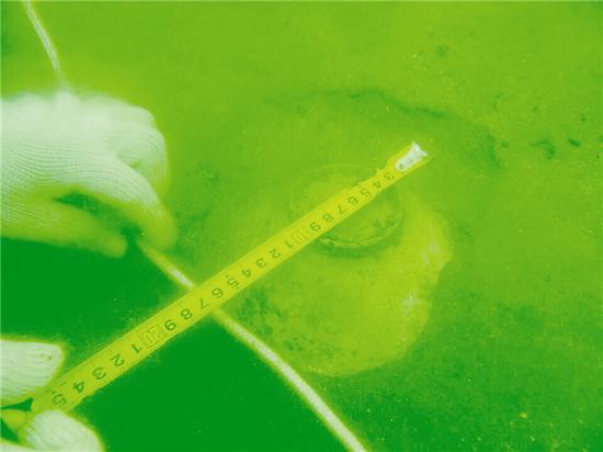 考古队员对水下的文物进行测量