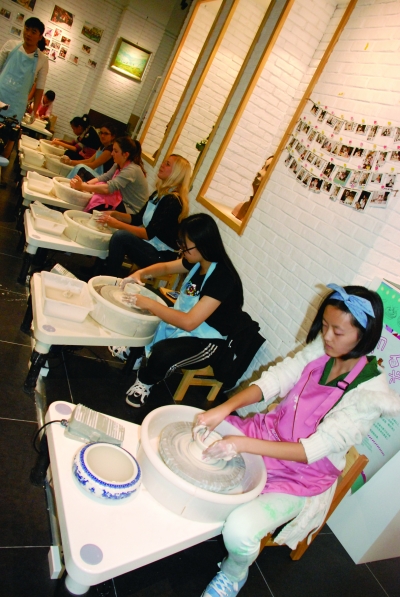 陶艺体验吧是北京陶瓷艺术馆内最具特色和吸引力的空间。据介绍,北京市朝阳区教委已将该区部分中小学的艺术实践课安排于该馆,从周一到周五,每天都有几个班级的学生在此过把“玩泥巴”瘾——细腻滑润、充满韧性的泥巴在手中塑形,“手随泥走,泥随手变”,逐渐拉坯成型;成型晾干后可以进行陶瓷绘画,随性而发;陶艺制作完成后,经过十几天的风干,再放入专门的电窑进行烧制,最终将成品交给体验者。陶艺体验吧提供制瓷教学、陶土塑形体验、陶瓷绘画体验、作品展示等服务。