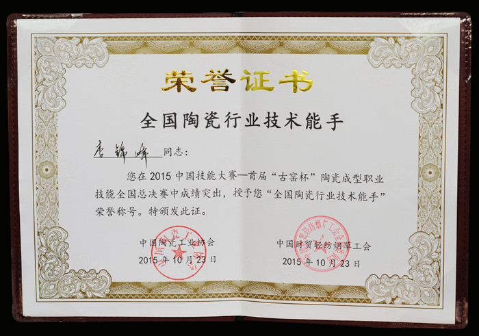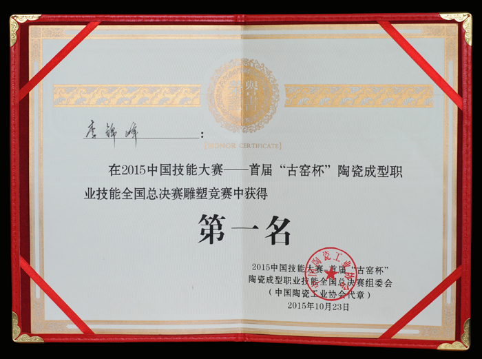 2015年10月21日至23日,由中国陶瓷工业协会、中国财贸轻纺烟草工会、中国就业培训技术指导中心、中国轻工业职业技能鉴定指导中心联合主办的2015中国技能大赛—首届“古窑杯”陶瓷成型职业技能竞赛总决赛在江西省景德镇市举行,该赛事分为陶瓷滚压成型工、陶瓷拉坯工、陶瓷雕塑工三个组别。从河北、江西、山东、广东等全国11个赛区脱颖而出的140名陶瓷技能好手大展身手,参与冠军的角逐。经过两天的激烈竞争,福建赛区推荐的李锦峰脱颖而出,一举摘下雕塑工种桂冠。
