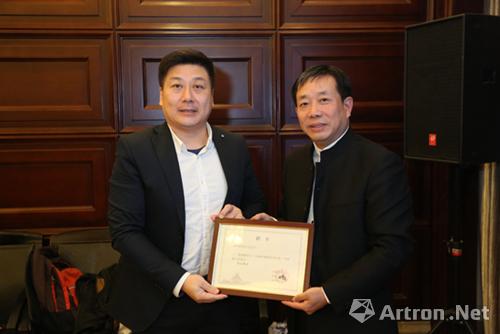 河南博物院院长田凯为台湾中华陶艺协会荣誉理事长苏正立(左)颁发展览专家聘任证书。