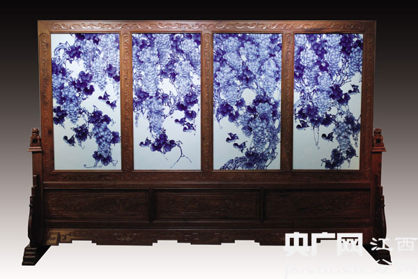 他的作品《硕果累累》正是一幅光影青花作品,作品内容以葡萄为主,把国画和西画结合,利用西画的光影效果来表现葡萄的光泽和立体感,给人以栩栩如生的感觉,而藤蔓上的小鸟却用国画的变形夸张的写意手法,表现出小鸟的灵动活泼,给人无限的遐想空间。