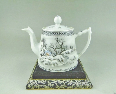 江边看“寒江晚渡”。图一是一只民国时期的雪景壶,和现在用的烧水壶有些类似,有壶把和壶嘴,壶高10厘米,口径6.5厘米,身长14.3厘米。这种壶有壶把可以手执,因此在古代也叫“执壶”。壶身施以粉彩,展示的正是冬天的傍晚,降雪之后,寒江晚渡的情形。如果身临其境,站在江边,只见江天连成一片,迷迷蒙蒙,雪白茫茫,飞雪仍在缓缓飘落,四周一片凄迷。一只孤舟由江心缓缓驶向江岸。江边的老树上,枯草上,房顶上都落了雪,小径被雪覆盖,没了道路,只有行人深深浅浅的脚印,走向远方。壶的另一边有题款:“寒江晚渡照塔影”,“时在乙酉冬月,凌云作”。凌云字美材,斋名凌云轩,江西新建人,是清末民初很有名望的粉彩画家,与“珠山八友”之首的王琦是同乡而且私交甚好,颇受其影响。