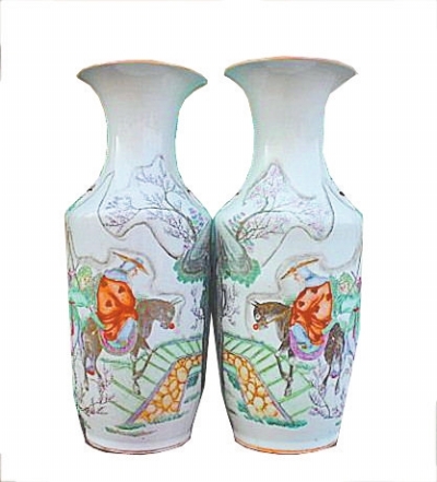 桥边看“红梅映雪”。图二是一对民国时期的粉彩棒槌瓶,敞口,细颈,丰肩,圈足,因呈棒槌状而得名。瓶高58厘米,口径21厘米,底径18厘米,瓶上的图景是著名的“踏雪寻梅”图。“踏雪寻梅”源自唐代诗人孟浩然,元代的剧作家费唐臣在《贬黄州》中有“为生扭做踏雪寻梅孟浩然”之句,正是说