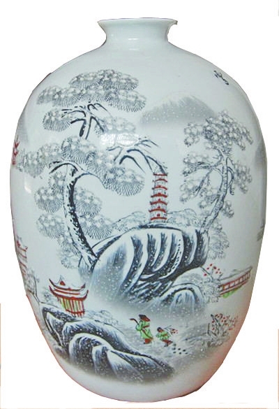 山间看“江山瑞雪”。图三是一只民国时期的粉彩冬瓜罐,敞口,短颈,丰肩,束腹,圈足,因形似冬瓜而得名。罐高32.5厘米,口径4.5厘米,底径8.7厘米,罐上展现的正是“江山瑞雪”图,只见莽莽苍苍的山间,有红色亭台,七层高塔,有连在江上的回廊,山上青松苍翠,纷纷瑞雪,飘落山间,一片洁白。一位头戴斗笠的隐士,正在山间路上,仰首远眺,江山如画,大地苍茫。他身后的小童扛着一株红梅,正随他向前走。边上有题款“江山瑞雪”,“辛巳年宜民作于景德镇”。