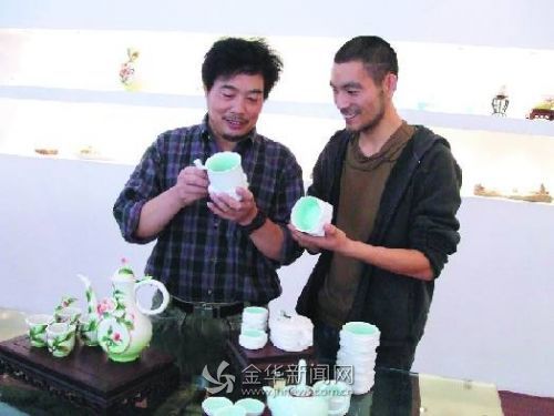 方益进(右)和尹根有正在欣赏陶瓷新作品。