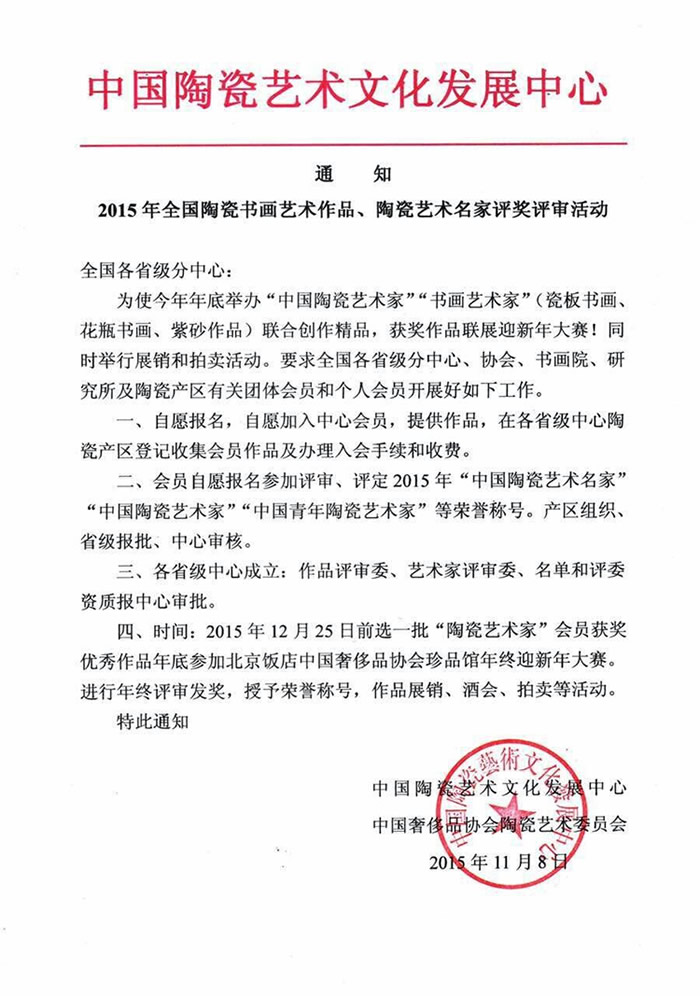 四、时间:2015年12月25日前选一批“陶瓷艺术家”会员获奖优秀作品年底参加北京饭店中国奢侈品协会珍品馆年终迎新年大赛。进行年终评审发奖,授予荣誉称号,作品展销、酒会、拍卖等活动。