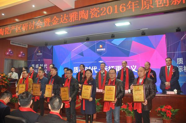 在几位嘉宾演讲暂告一段落之后,举行的是“金达雅陶瓷2015年优秀经销商和忠诚经销商颁奖”环节。共有7位经销商荣获“金达雅陶瓷年度优秀经销商”的奖项,17位经销商获得“金达雅陶瓷忠诚经销商”的称号。
