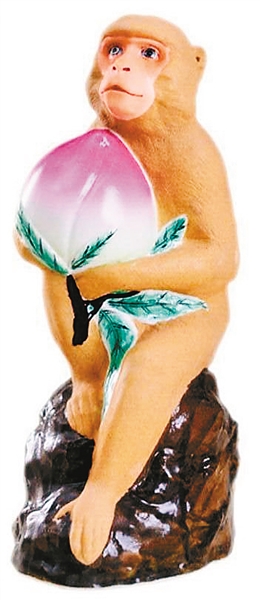 其一,猴子献桃象征长寿。这件“金猴献寿”是景德镇工艺大师张育贤的作品。作品中一只灵猴身坐仙山福地上,手捧着鲜艳无比、硕大水灵、香气馥郁的仙桃。桃为五木之精,传说仙境中生长的桃树,三千年一结果,结出仙桃是增寿的瑞果。此件器物釉色恰到好处地表现出猴子身上的茸毛以及炯炯有神的目光。作品栩栩如生、动感十足,以写实造型手法赋予了灵猴深邃的文化底蕴和现代瓷雕艺术的审美价值,以全新的陶瓷艺术语言表达了“新春纳福、金猴献寿”的吉祥祝福。