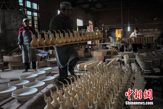 云南省玉溪市易门县滇鉴陶瓷制品厂内,工人正按照传统方法烧制瓷碗。