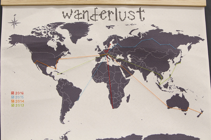 其次,产品强调消费者参与创作的体验。一幅针线织出的、挂在家里墙上的世界地图,可以供消费者自己添加“旅行足迹”,用不同颜色的一针一线穿插,勾勒出只属于自己的成长历程。同样的地图类产品,还有立体的地球仪,旅行者每去过一地,便可在地球仪上按插入标志。