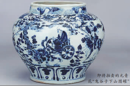 记者在二楼展厅的显眼位置,看到这件“鬼谷子下山图罐”,数名收藏圈人士正在旁边欣赏。其中一位男士告诉记者,这就是鼎鼎大名的元青花瓷。记者查阅资料发现,相同题材的元青花大罐,曾在2005年拍出2.3亿元(含佣金)的高价,创下了当时中国艺术品在世界上的最高拍卖纪录。