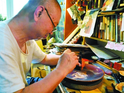 年过七旬的茅子芳住在朝阳区南沙滩社区,他有一个绝活儿,那就是用金刚刀在瓷器上进行篆刻。