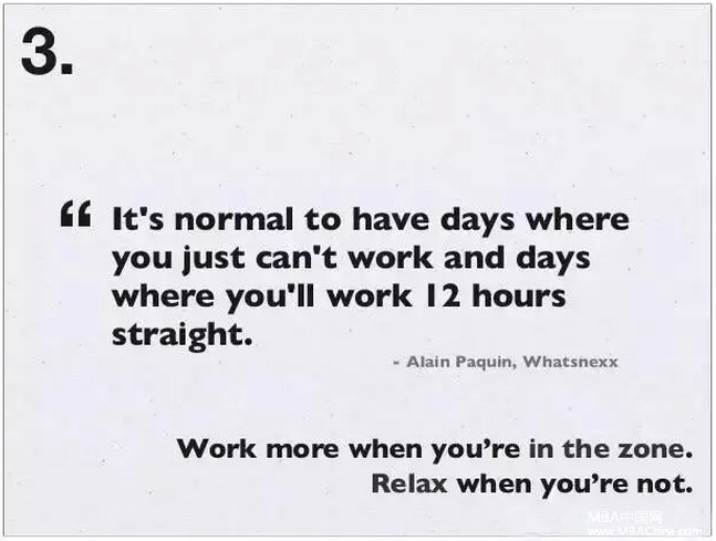 在状态时,多干点;不然就好好休息:有时会连着几天不在工作状态,有时在工作状态却又天天忙活12个小时,这都很正常。
