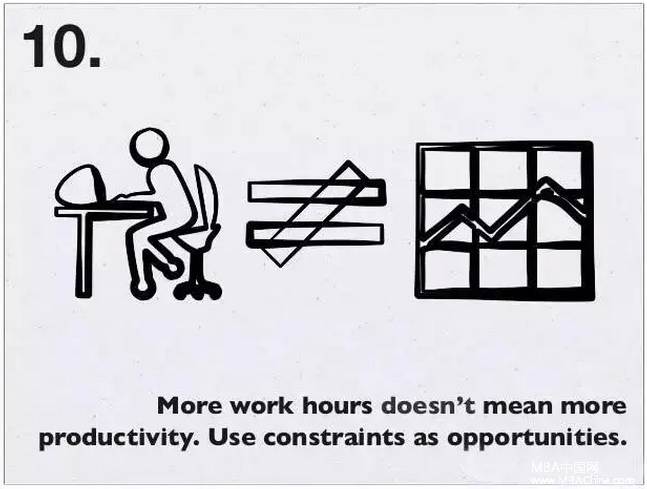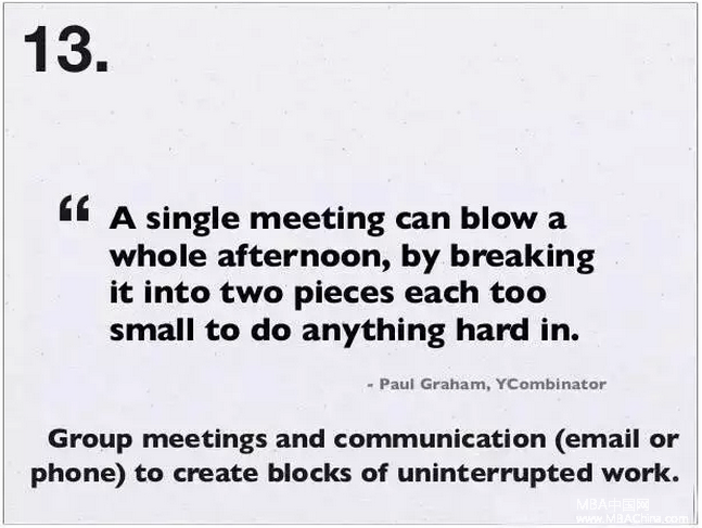把会议和沟通 (邮件或电话) 结合,创造不间断工作时间:一个小会,也会毁了一个下午,因为它会把下午撕成两个较小的时间段,以至于什么也干不成。