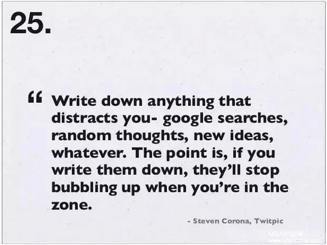 进入高效状态后,记下任何分散你注意力的东西,比如Google搜索词、刹那的想法、新点子等。若把它们记下来,它就不会再蹦来蹦去了。