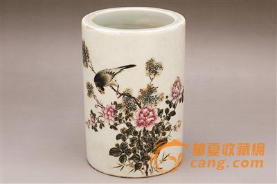 图一:“喜鹊报春”粉彩笔筒(民国)