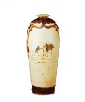 瓶高63cm,口径7.8cm,足径13cm。瓶唇口外撇,短颈,丰肩,直腹,宽圈足,沙底。瓶肩部绘一周黑彩花瓣纹,两组下垂卷叶纹如垂蔓一般将瓶腹分为两幅画面:一幅是小猴立行在泛着涟漪的水边似在张口呼唤,小鹿则驻足点点芦苇旁观望;另一幅是飞翔的双雁掠过水面欲落觅食。