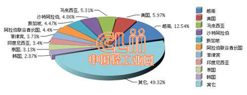 从出口增速看,对越南、阿拉伯联合酋长国、美国、菲律宾出口额大幅增长,增速在30%以上。其中出口越南占比在上年度升至首位后继续保持较快增长,占比较上年提高了4.36个百分点。对美国出口由上年第五升至第二,占比提高了1.62个百分点。而对马来西亚、印度尼西亚出口同比下降,降幅分别为6.86%、27.18%,详见图2。