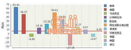 图2 2015年1~12月我国陶瓷砖累计出口额主要贸易国同比增长情况