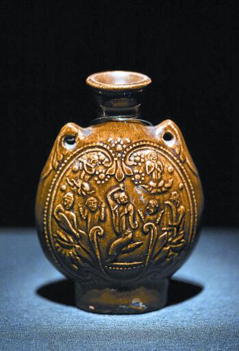 这件北朝时期铅褐釉印花人物纹扁瓶,高12.2厘米、口径3.1厘米、足径4.9厘米,现藏于故宫博物院。瓶呈扁圆形,上窄下宽,略似杏核。敞口,短颈,假圈足。通体施褐绿色低温铅釉,釉层光亮。肩部对称置圆形鼻纽,以便穿绳携带。颈与肩相接部分有一周联珠纹。腹部两面均模印5人一组的胡腾乐舞图案。中央一人于莲座上翩翩起舞,右二人一吹奏横笛,一人打拍。左二人,一执琵琶弹奏,一人双手击钹。五人均深目高鼻,身穿窄袖长衫,腰间系带,脚蹬长靴,是当时西域人的形象。