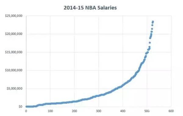 这个世界的财富分配是极端极端极端不均衡的。站在塔顶的人占有着这个世界的大多数财富。在靠本事吃饭的领域, 这种不均衡也非常明显。下图是2014-15赛季NBA球员的薪酬分布(横轴表示球员的薪酬排名,越往右则排名越高,纵轴就是年薪的金额):