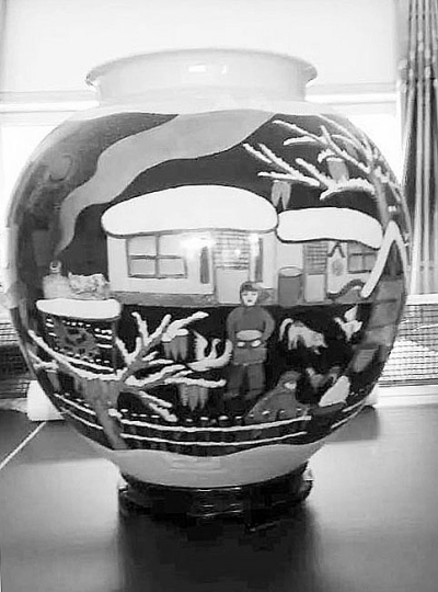 历经三年的努力,刘丹终于成功地研制出陶瓷农民画,并投入了批量生产。今年年初,第一批陶瓷农民画成品终于摆在了基地的货架上,瓷瓶、装饰盘、酒壶、茶具等,类型多样。新的陶瓷制品既有高白瓷色泽洁白、传热保温性能适中的实用性,又有形象质朴、色彩明快的东丰农民画的审美艺术性,极大地丰富了农民画的表现形式,为农民画开拓出更加宽广的发展空间。