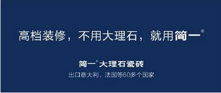 在1400多个中国陶瓷品牌中,简一大理石瓷砖以创新的力量让中国陶瓷赢得世界尊重。2009年,简一全球首创大理石瓷砖,以极致工艺还原世界珍稀石材纹理,为追求高品质生活的人们提供高端、环保的装饰材料,目前简一已成为中国高档装修的首选材料。大理石瓷砖是中国人创造的名词,被誉为“偷走了上帝的指纹”,在意大利也开始出现仿石纹理的产品。